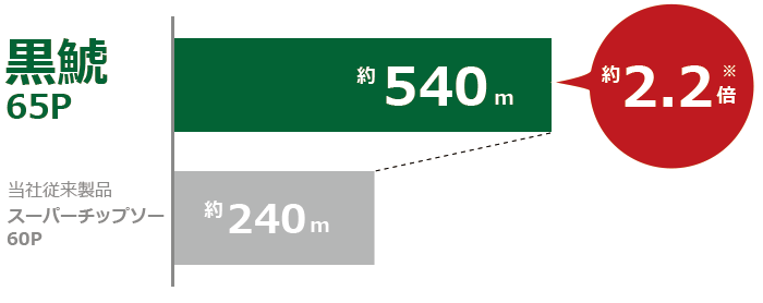 黒鯱は約540m、当社従来製品(スーパーチップソー)は約240mで、約2.2倍の長寿命