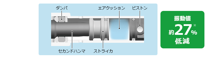 ダンパの体積とエアクッションの容積を大きくすることで打撃時に生じる衝撃とピストン反力を抑え、振動を大幅に低減しました。また、本体の浮き上がりが少ないため、軽い押付けでも十分な性能を発揮します。