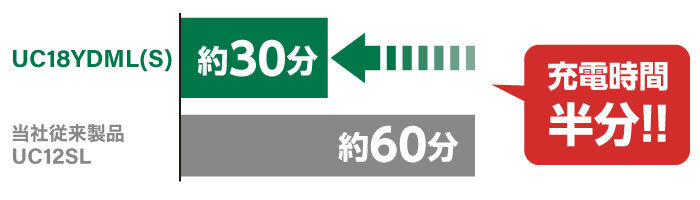 UC12SL(10.8V充電器)の半分の時間で充電でき、充電効率が大幅にアップします。