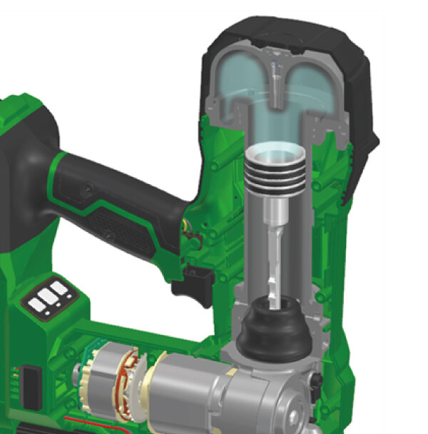 ガスカートリッジを使わないエアスプリング方式を採用し、排気が出ないため屋内でも快適に使用可能。燃焼式ではないため、寒冷地や高地などの環境に左右されにくく、安定した打込みを実現します。